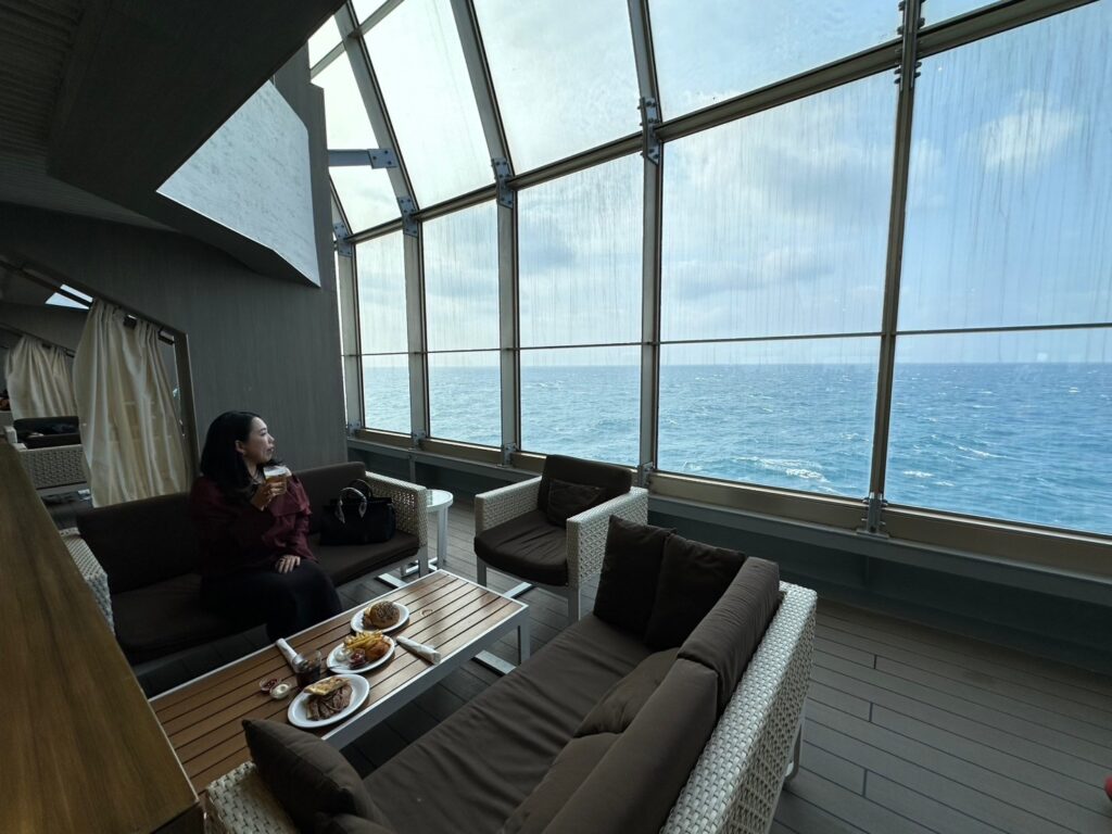 船内では語学のレッスンやダンスレッスンなどのイベントも無料でたくさん行われていますが、私たち夫婦が海が好きなので、お部屋のバルコニーでただ海を眺める贅沢なひと時を過ごしました。