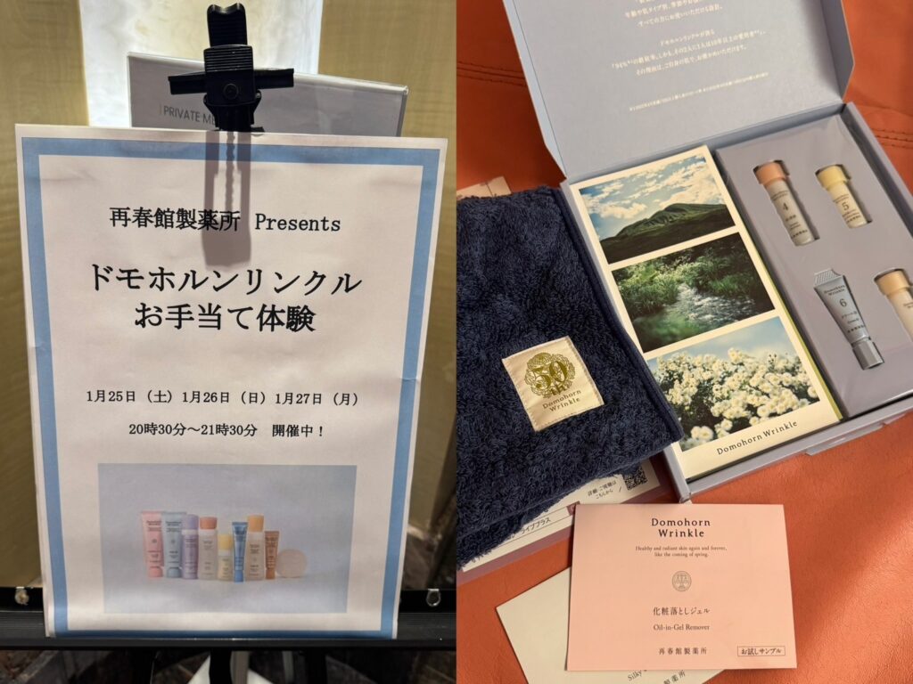 夜はお部屋にチラシが入っていたドモホルンリンクルの体験会に参加しました。