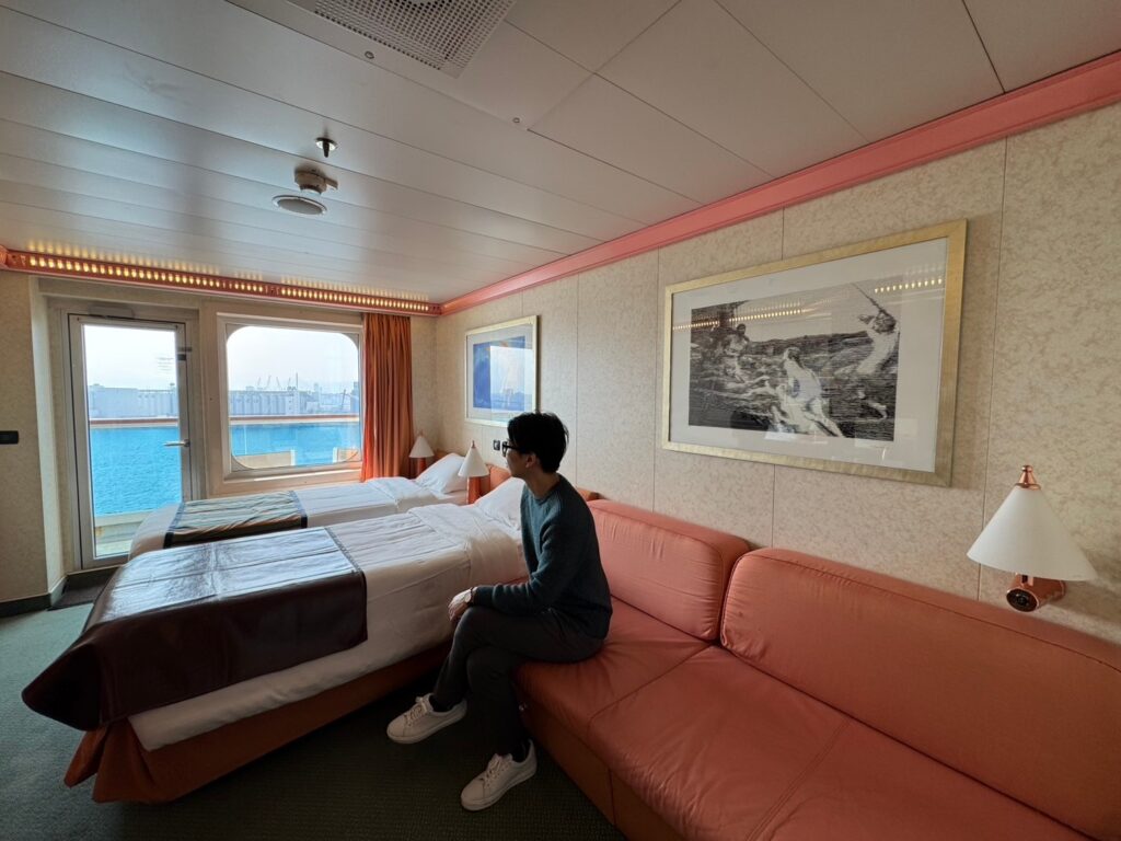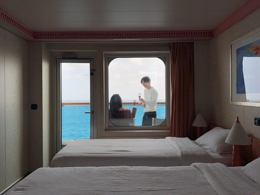 クルーズ旅の良いところはやはり美しい海をいつでも感じられるところなので窓有り、もしくはバルコニー付きのお部屋が断然オススメです。