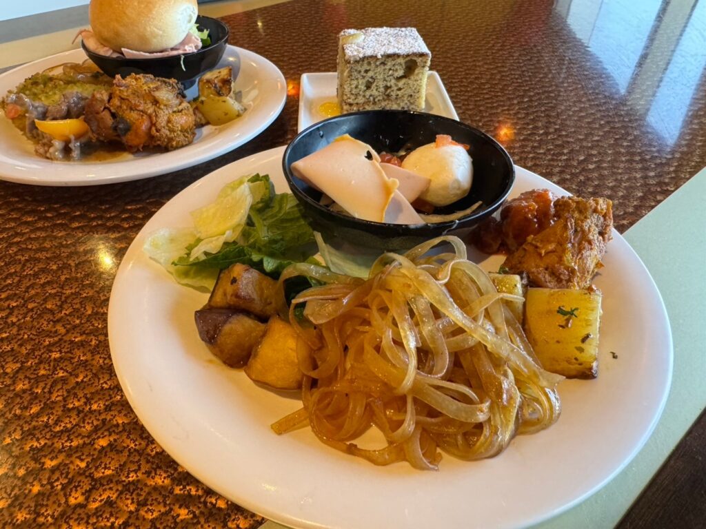 前菜からメイン、デザートまで選択肢が豊富でいくつでも好きなものを選んで食べられますし、牛丼などの日本食メニューも充実していました。