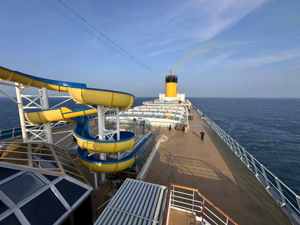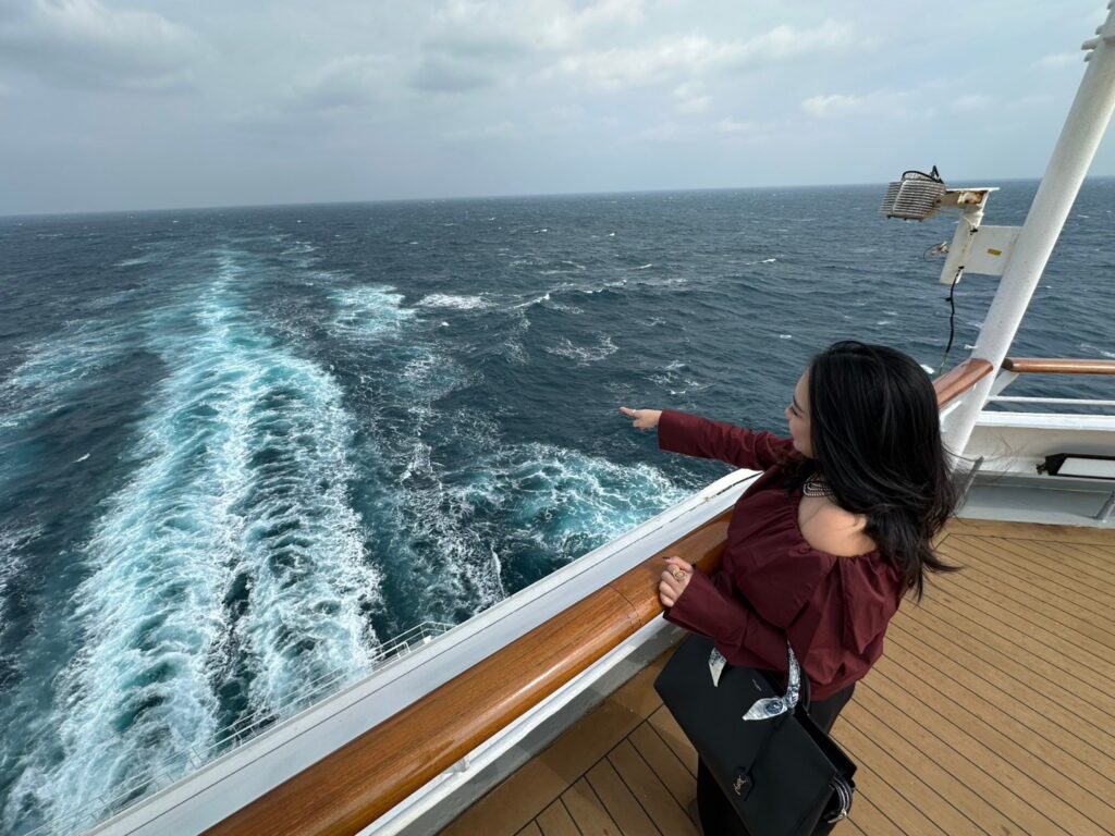 特に天気が良い日はデッキに出て潮風を感じるのがクルーズ旅の醍醐味で、個人的には後方デッキの船が進んだあとにできる引き波を見るのが好きです。