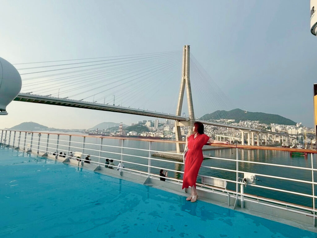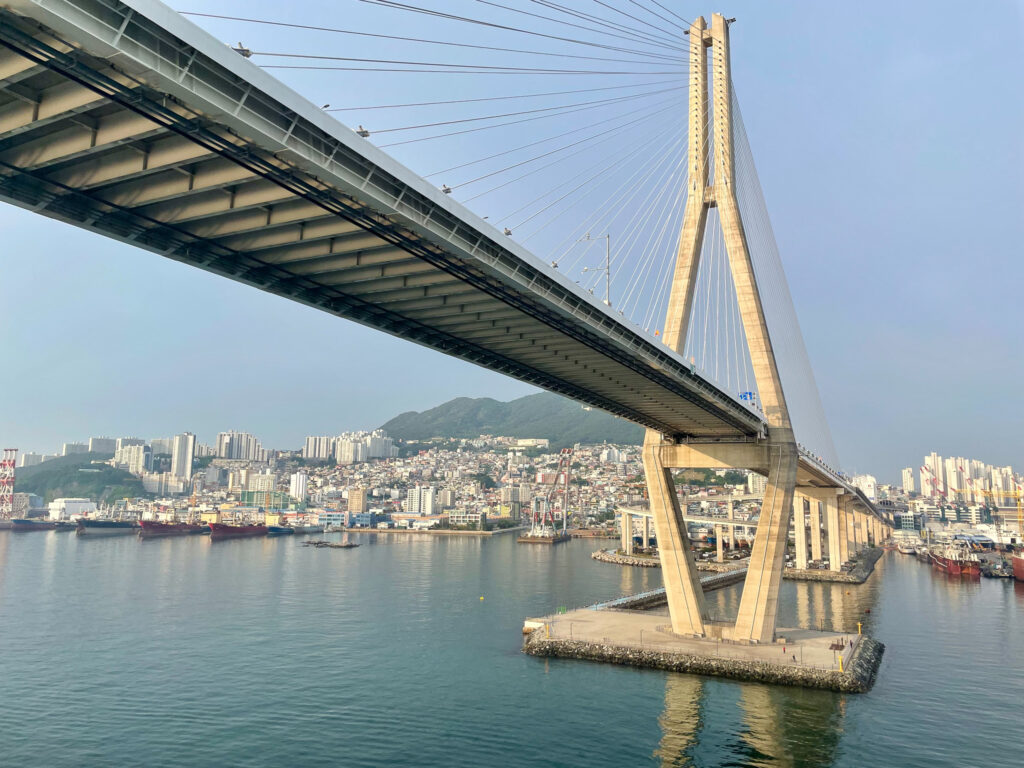 寄港の直前には、釜山大橋の下ギリギリを船がくぐるスリリングな体験からスタート。