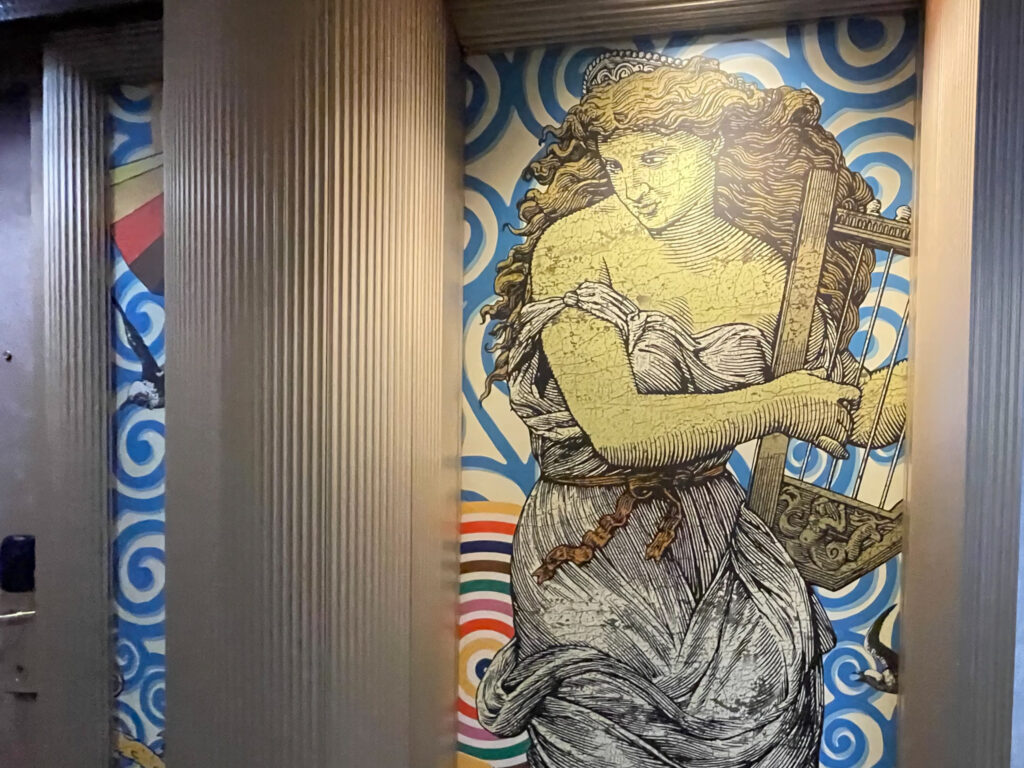 色鮮やかなインテリアに、美しい彫刻や装飾、遊び心あふれる照明。エントランスホールを見上げれば、ゴージャスな吹き抜けと、らせん階段。