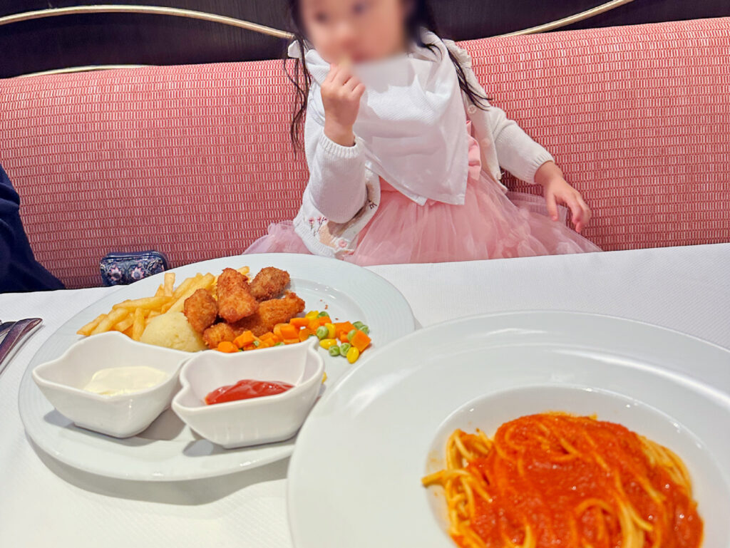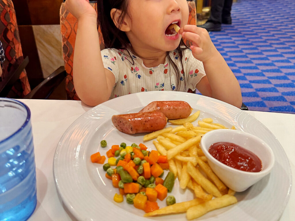 メインダイニングでは、ハンバーグやフライドポテトなどの子どもが喜ぶメニューに加え、ゆで野菜や野菜のピューレといった小さなお子さまにもやさしい内容が用意されていて、幅広い年齢の子どもたちが楽しめるよう工夫されているなと感じました。