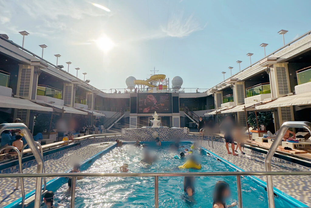船内では、屋内外のプールをはじめ、キッズプログラムや夜のショー、生演奏など、毎日楽しめるイベントがたくさん用意されていて、家族みんなで満喫できます。