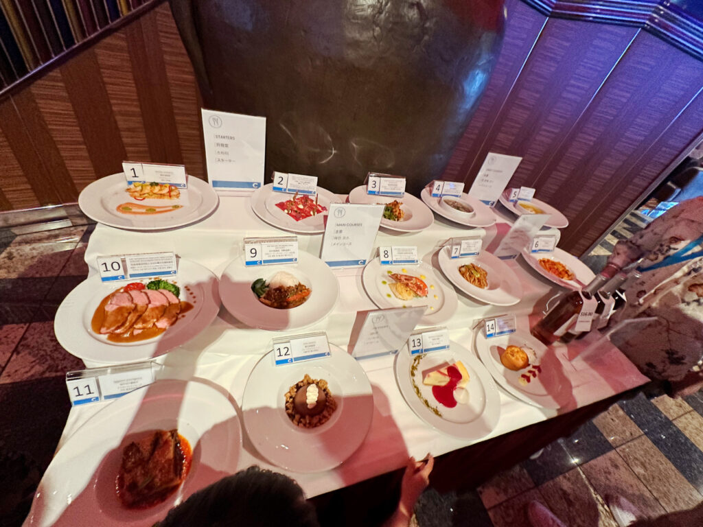 また、メインダイニングでのメニューは、レストラン前に実物ディスプレイがあり、QRコードを読み取ると日本語表記で確認できる仕組みになっていました。気になるメニューを指さして注文できるので、英語が苦手でもまったく問題ありません。