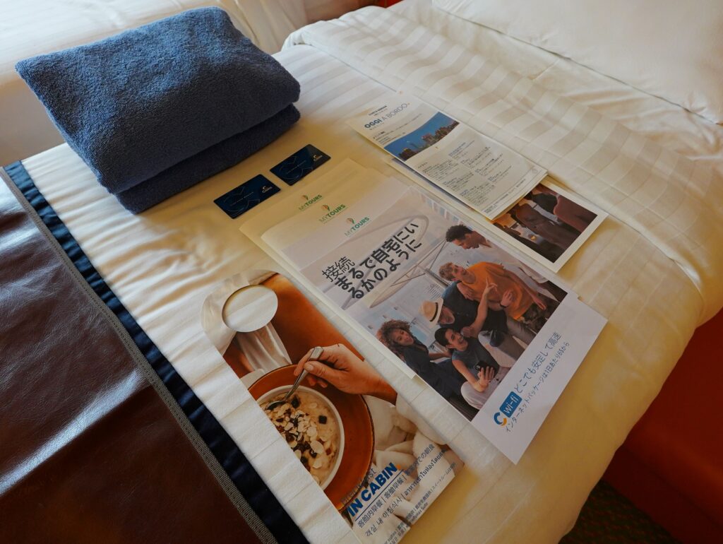 ベッドメイキングと清掃は1日1回。日本語での船内新聞もありました。