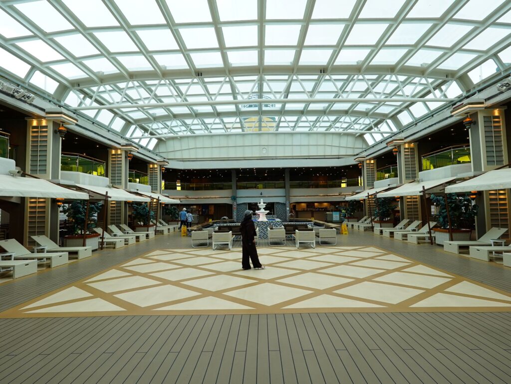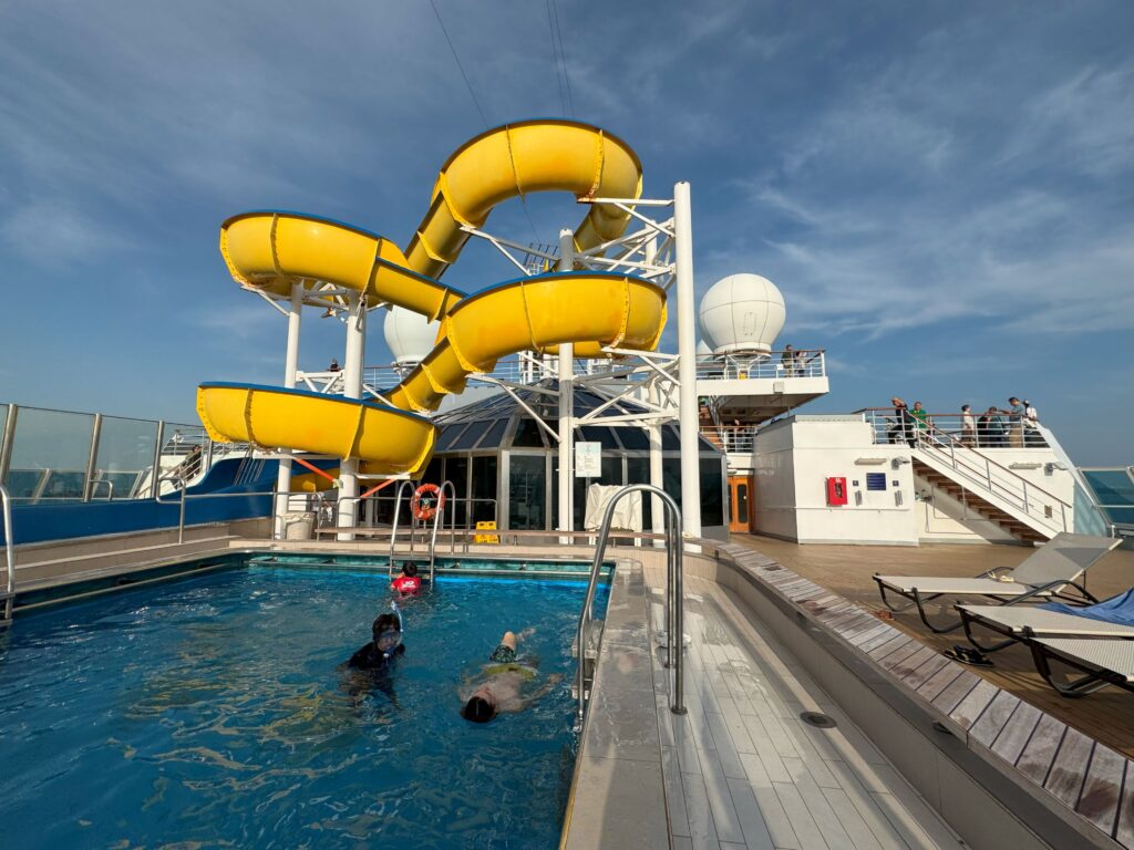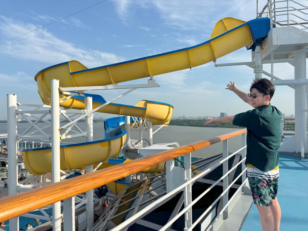 前回の1月クルーズでは肌寒くデッキに出ることが少なかったですが、今回は特に屋上デッキのプールやスライダーが開放的で最高でした。