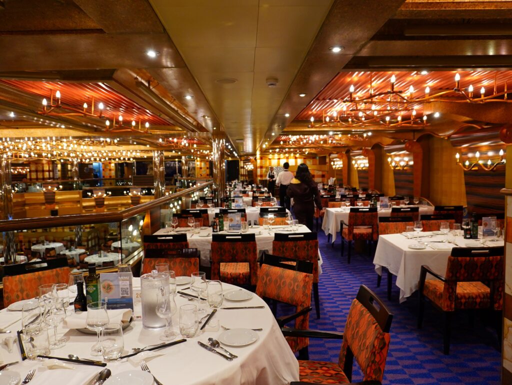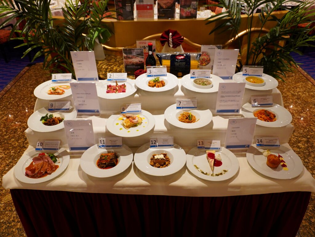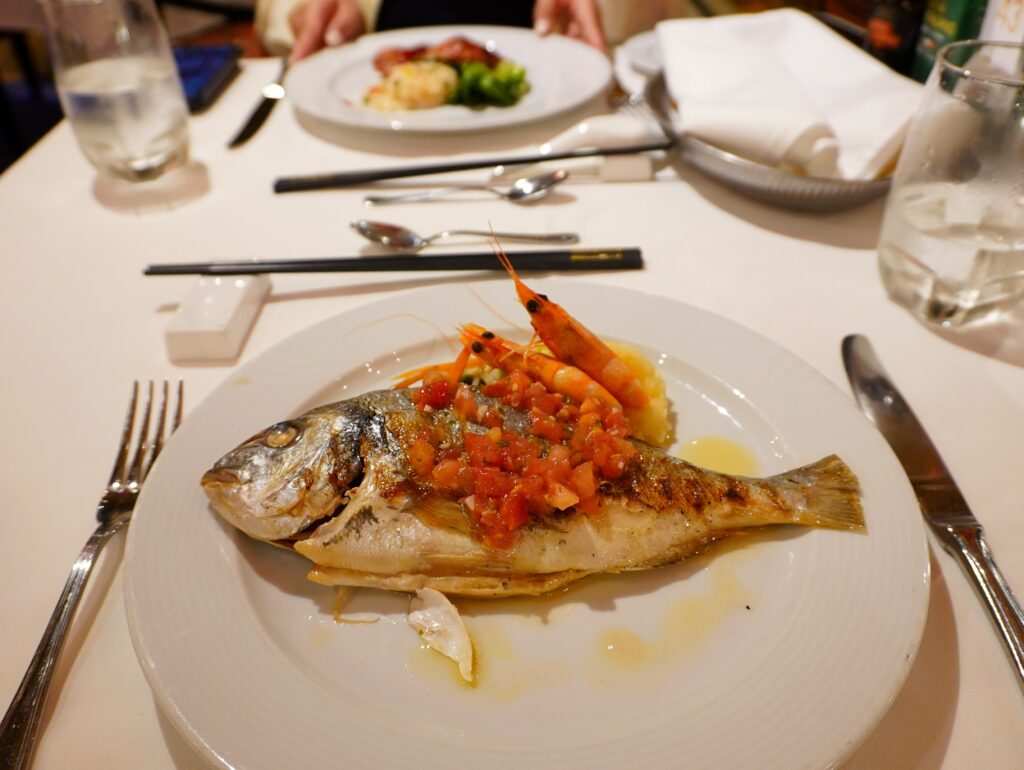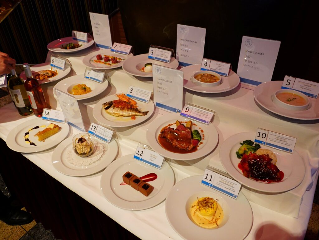 そして、クルーズならではの特筆すべき点は、メインダイニングでのコース料理の自由度の高さにあります。前菜、メイン料理を3品、デザートはパスしたりと、その日の気分や食欲に合わせて自由に組み合わせることができるのです。これは、地上の一般的なレストランでは考えられない贅沢ですよね。もちろんビュッフェとのハシゴも可能です。笑
