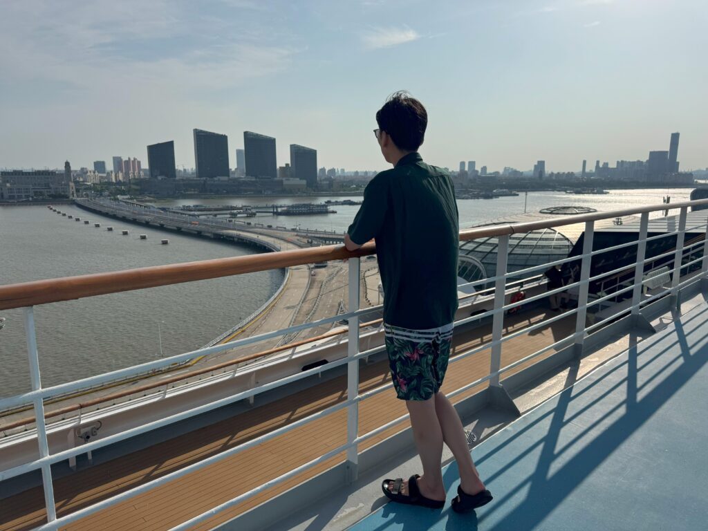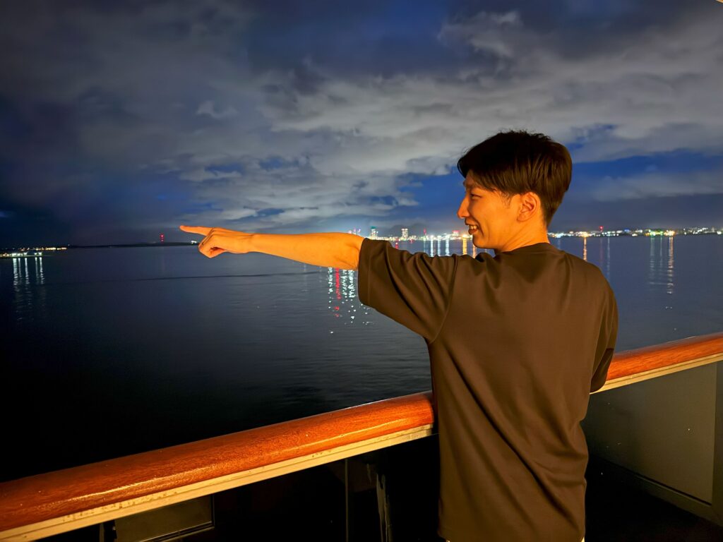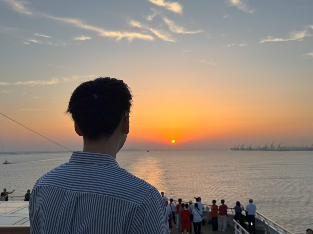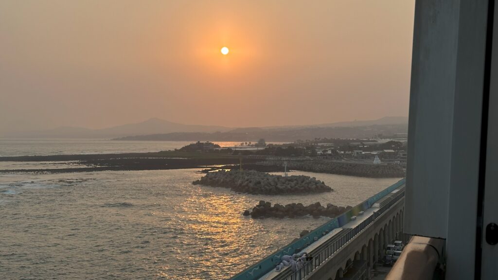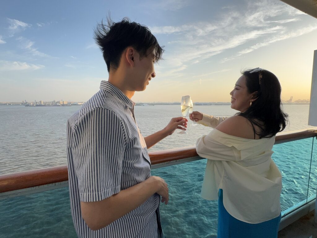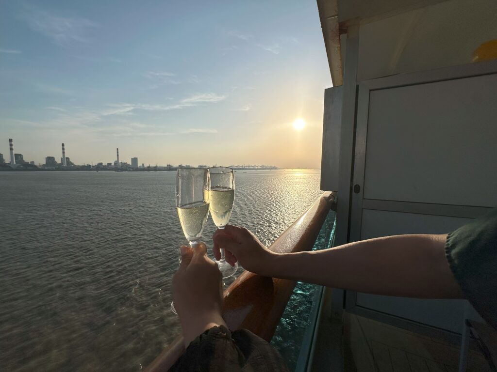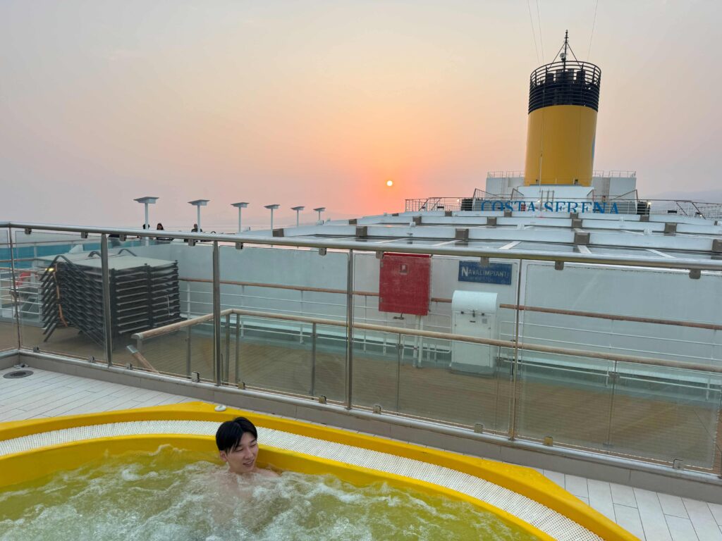 船旅の魅力といえば、やはり船上から眺める息をのむようなサンセットです。何も遮るものがないからこそ、時間を忘れて見入ってしまうほどの美しさ。前回の台湾クルーズでも感動しましたが、今回はデッキやジャグジーから潮風を感じながら、まさに船旅ならではの景色を心ゆくまで堪能しました。