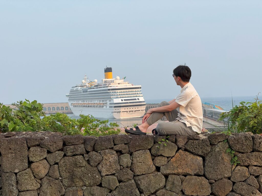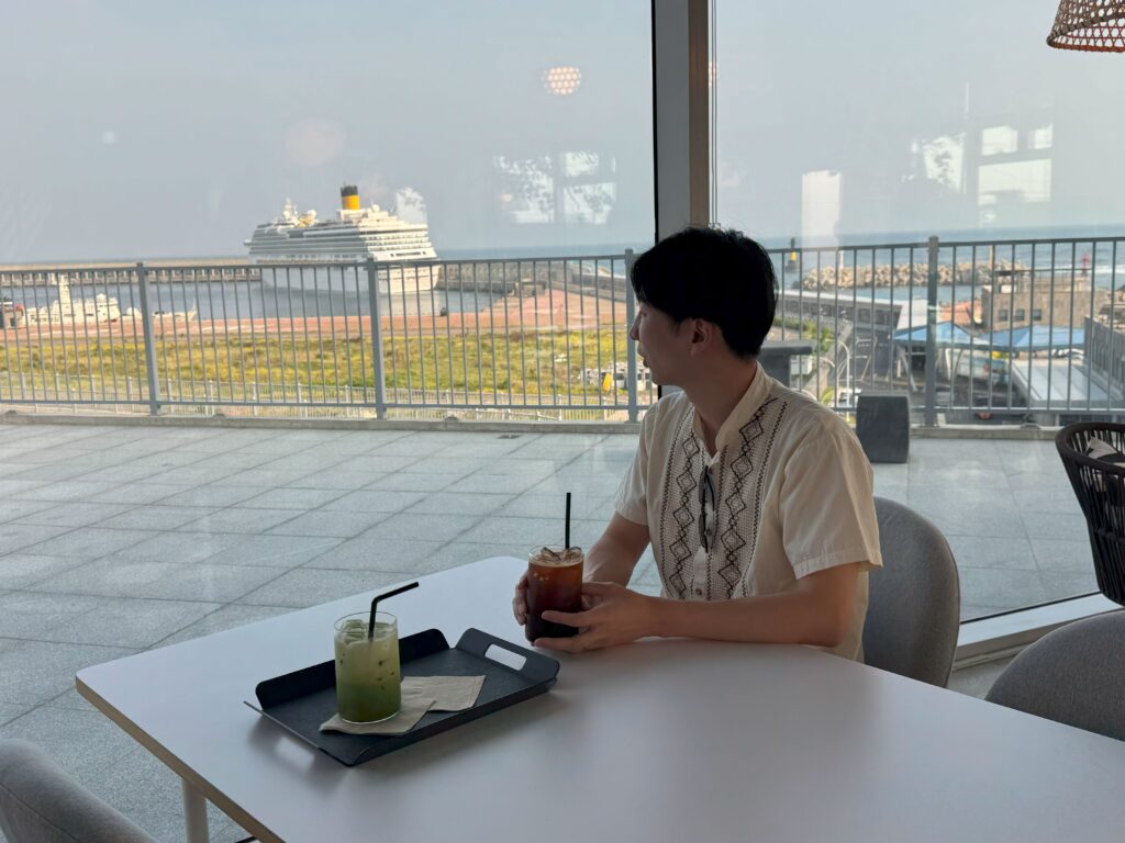 済州島はロケーションの素敵なカフェもあり、短い時間ながらも癒しのひとときを過ごすことができました。自分達が乗船しているクルーズを、陸から見つけると、なんだかテンションが上がりますよね。
