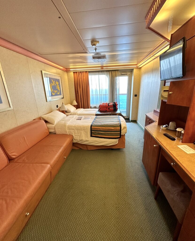 お部屋の広さは都内のシティホテルと比べるとコンパクトだが、インサイドの窓無しの部屋と比べるとソファーもあるし幾分か広い。また毎日のように風を感じることも、ベッドに横になりながら海に沈む夕日や朝日を眺めることができるのもバルコニー付の特権だ。