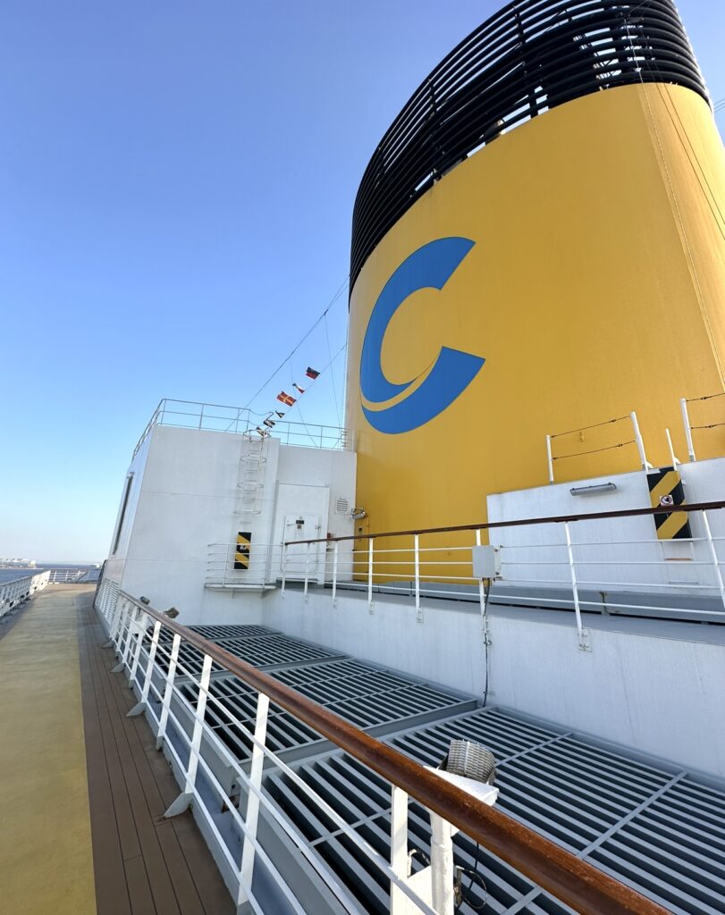 お台場の手前あたりからコスタのファンネル「C」のマークを望むことができ、「ママ見て!僕たちの乗る船だ」と叫ぶ息子の笑顔がまぶしかった。