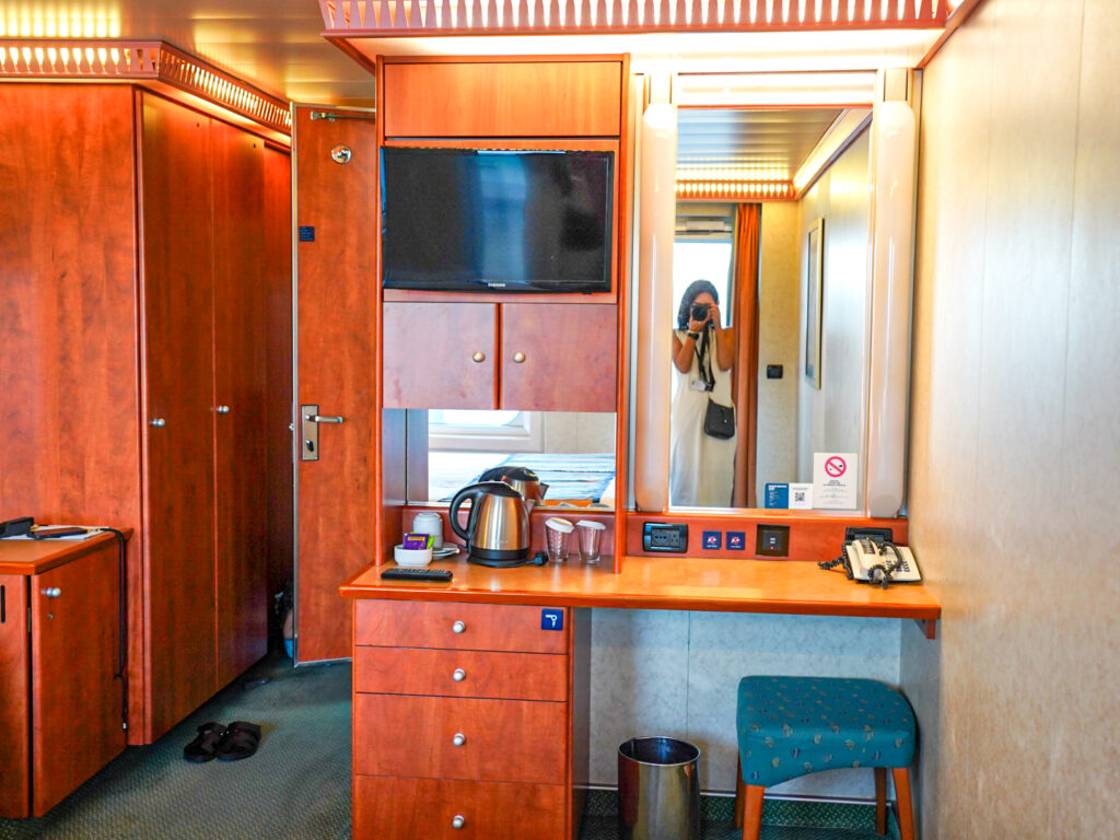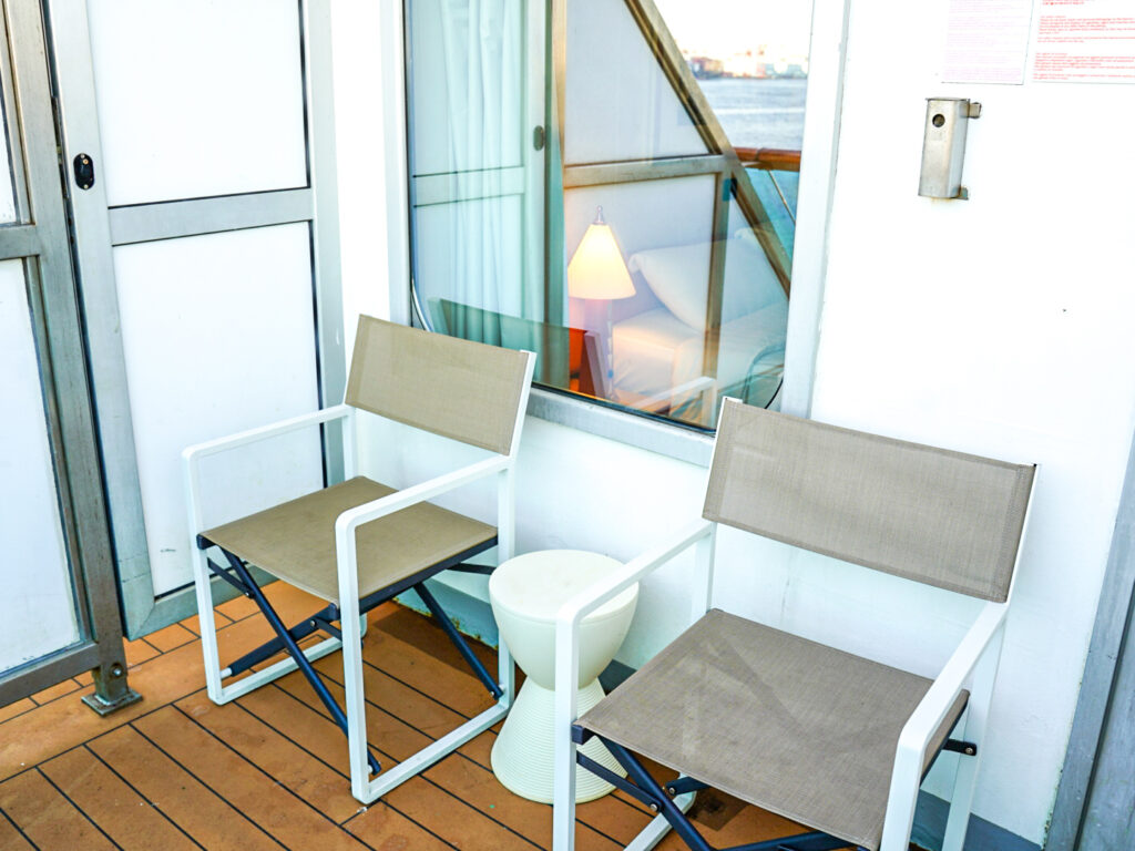 今回宿泊したのはバルコニー付き客室。はじめて船尾のキャビンでしたので流れゆく海を眺めながらクルーズ旅らしい優雅な時間を過ごすことができました。