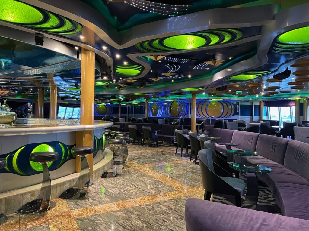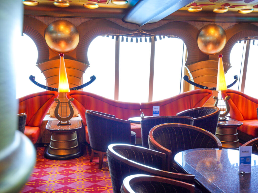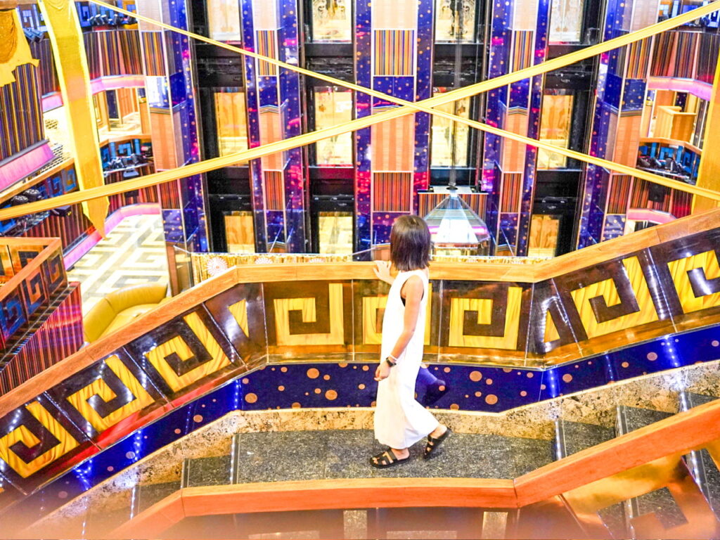 船内中央に位置するアトリウムはお昼はピアノの演奏をしていたり夜はパーティー会場に様変わり