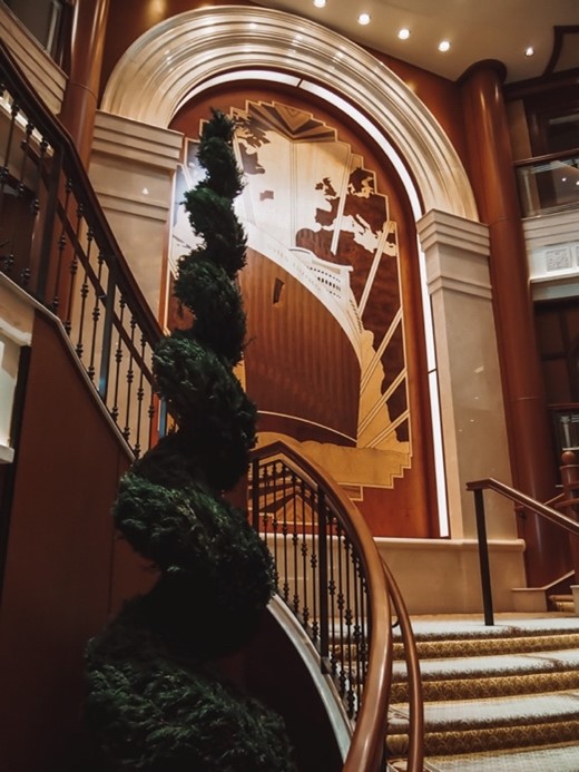 階段には初代クイーン・エリザベスをモデルにした寄木細工が飾られ人気の撮影スポットとなっていました。