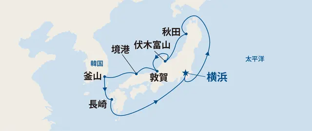 横浜(神奈川) ⇒ 終日クルージング ⇒ 秋田 ⇒ 伏木(富山) ⇒ 敦賀(福井) ⇒ 境港(鳥取) ⇒ 釜山(韓国) ⇒ 長崎 ⇒ 終日クルージング ⇒ 横浜(神奈川)