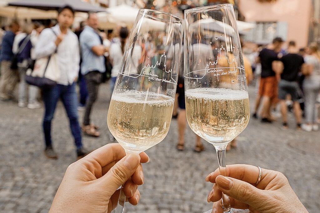 コッヘムの町の名前とお城のシルエットがプリントされた可愛いオリジナルグラスを€3で購入(シャンパングラスとワイングラスが選べました)、飲み物は€2.5〜3.5くらい。私たちはガイドさんがツアー中に紹介していたSect(ゼクト)というドイツのシャンパンを飲んでみました。軽くて美味しかったです。