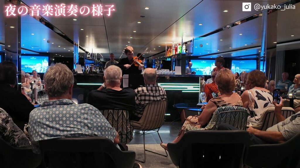 さらに夜にはプールの底がせり上がり、シアタールームに変身。映画鑑賞を楽しめるユニークな仕掛けが魅力です。毎晩ラウンジで行われる「ポートトーク」では翌日の寄港地の情報を詳しく聞けるので、観光の楽しみも倍増します。料理長からこの後のディナーの紹介も行われます。