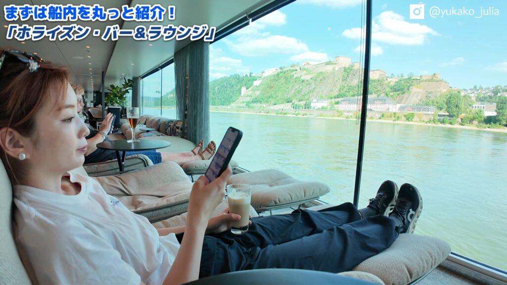 また、ラウンジではいつでも軽食やコーヒーが楽しめ、雨の日や観光後に一息つくのにぴったり。ラウンジの大きな窓からは川沿いの景色が広がり、動く絵画のような美しさを堪能できます。