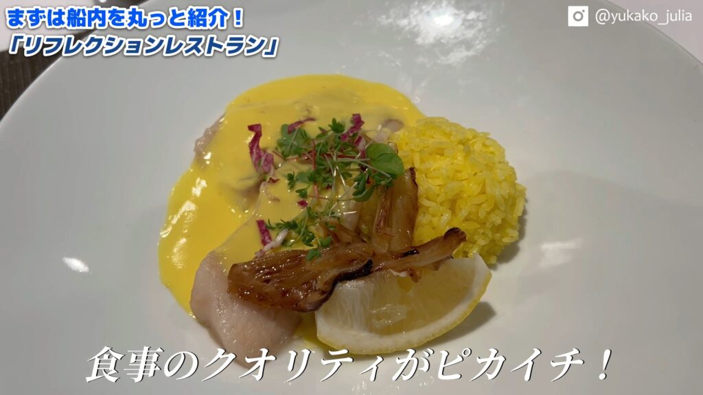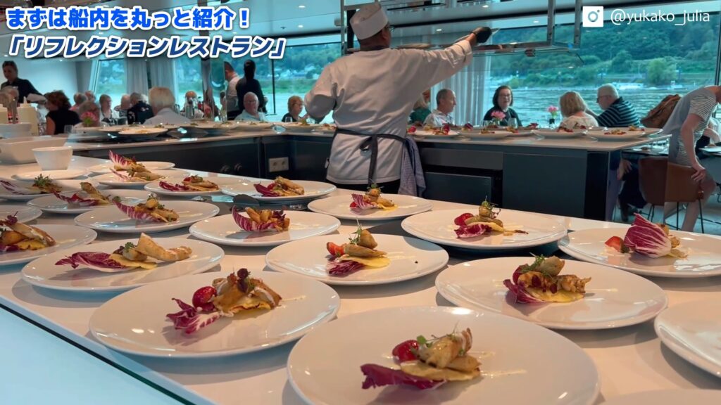 リバークルーズの楽しみの一つが、各地の食材を取り入れた船内食事。朝食は新鮮なフルーツやサラダ、ジュースやパンが揃い、ヨーロッパならではのデザートも充実しています。夕食は見た目も味も大満足のクオリティで、毎晩異なるコースメニューが提供され、ドイツ産の魚・テラピアにレモンソースをかけたものなどが登場。