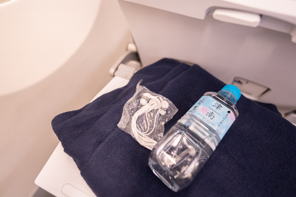 座席にはペットボトルのお水とブランケット、イヤホンが備えられています。