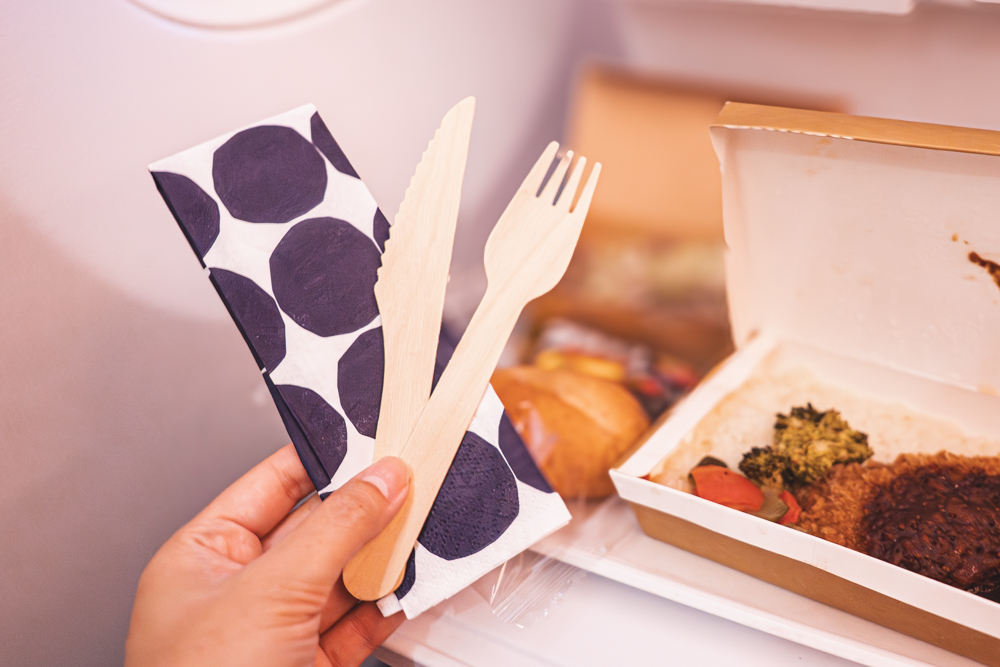 フィンエアーは飛行によるCO2排出量を抑えるため、機内の備品をできる限り軽量化する取り組みを進めているそう。