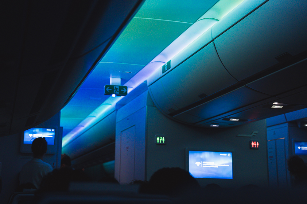 エコノミークラスは座席数が多く天井が長いので、グラデーション状にゆっくりと移り変わっていくこの光のショーが綺麗に映えますね。