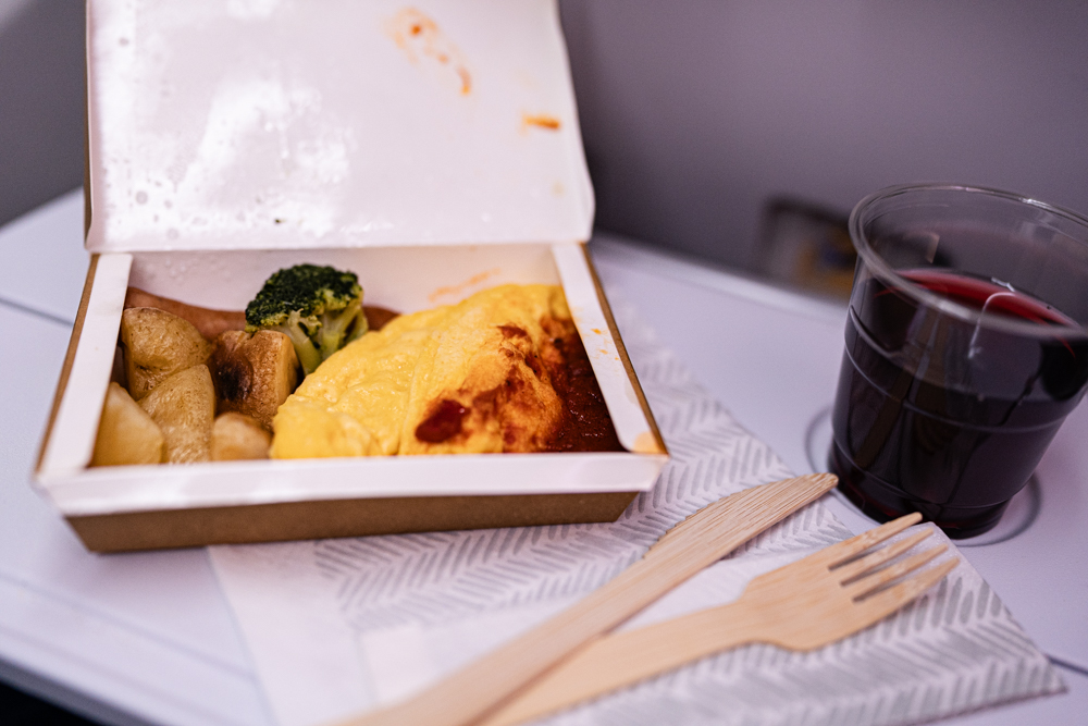 食事は離陸後のメインの機内食と、到着直前の朝食の2回提供されます。
