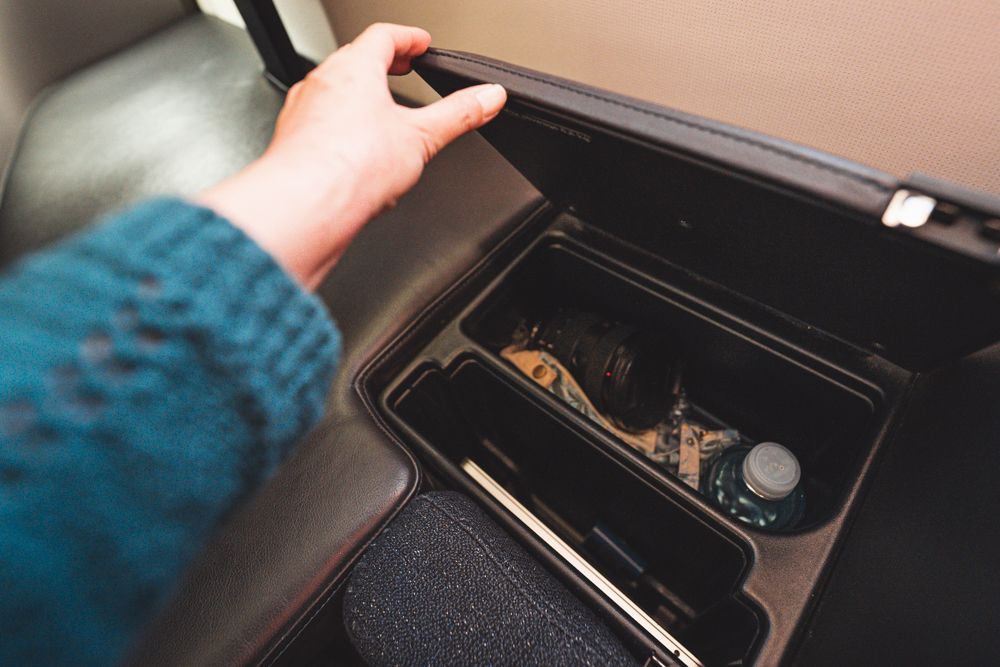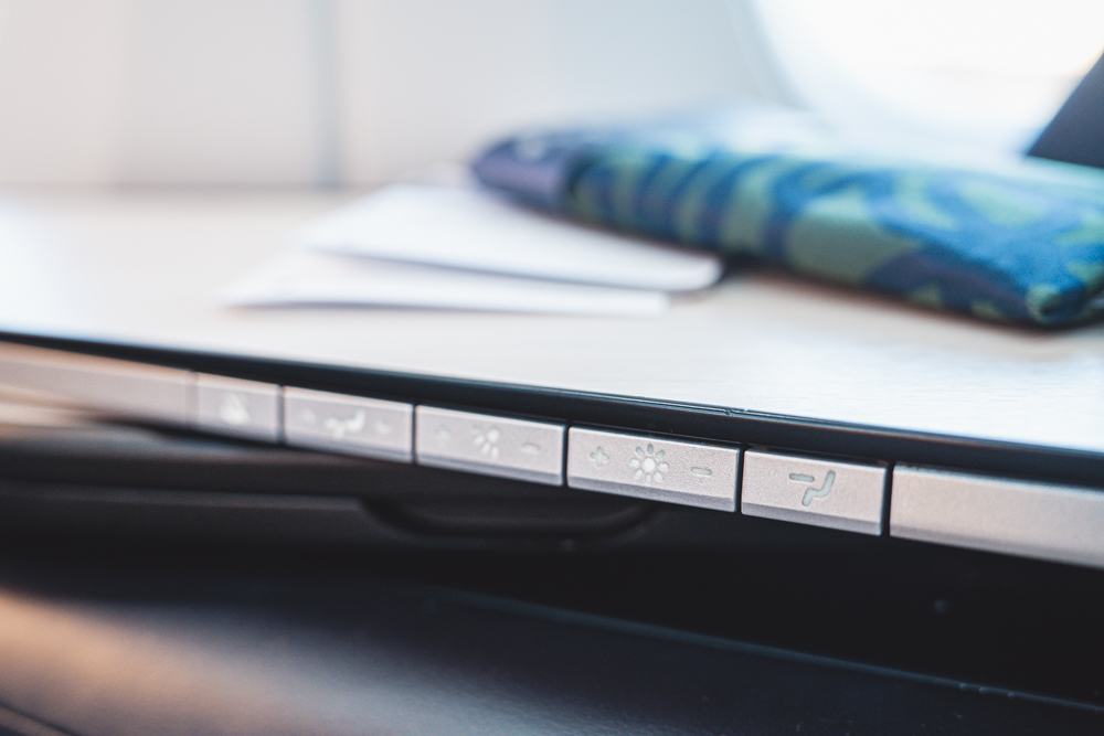 窓際のテーブルにはシートの操作パネルがついており、足元をフラットにしたり、電気をつけたり、音量調節したり、座ったままでも寝たままでも操作可能です。