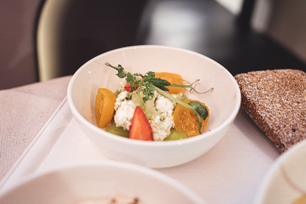 最初の機内食は、2点のスターター、メイン(3つのメニューの中から選択)、チーズ、デザートが提供されました。