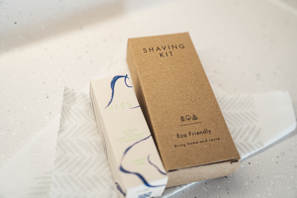 トイレの中には、自由に使えるようSEESのリップバームとシェービングキットも置かれていました。