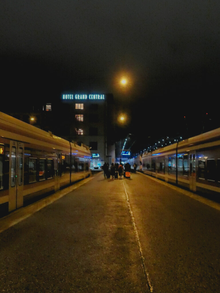 (左)暗い時間の長い冬季は到着時には外は真っ暗でした。