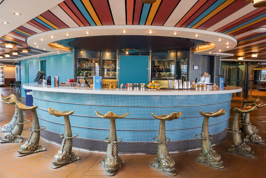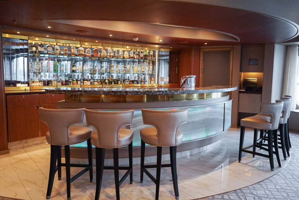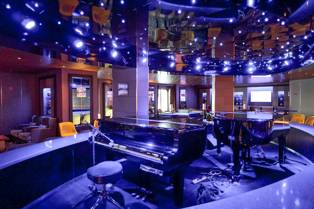 船内トップのラグジュアリーダイニング「ピナクルグリル」の正面に位置する「ピナクルバー」もまた、船内で一番ゴージャスなバー・ラウンジ。ドレスアップして特別なディナーの前後に立ち寄りたい場所です。