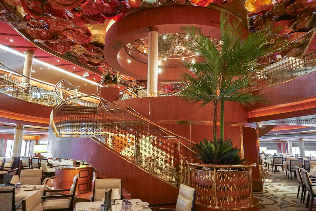 「ザ・ダイニング・ルーム」は、朝食・ランチ・ディナーを展開するメインダイニング。乗船前に確約できる予約サービスは2部制です(1回目:17:30〜18:00頃開始、2回目:19:30〜20:00頃開始)。2フロアにたくさんの座席を有しているので、予約なしでも空席があればウォークインで利用できるオープンシーティングを採用しています。
