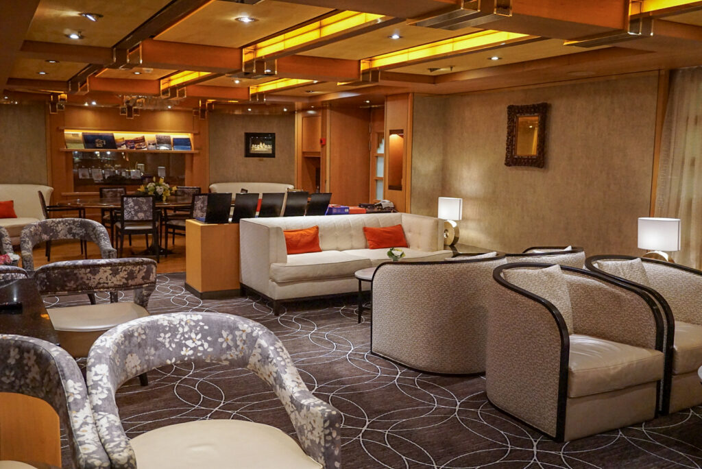 ゆったりと落ち着いた空間の「エクスプローラーズ・ラウンジ」。この日は大きな生花が飾られていたのが印象的でした。