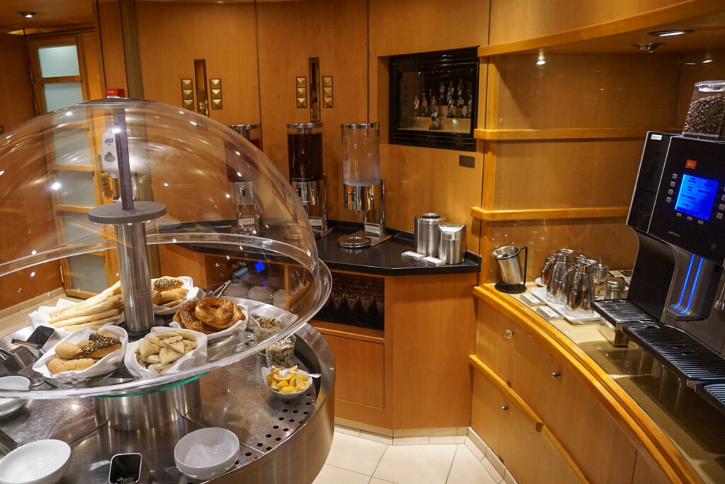 パンやカナッペ、プチスイーツなどの軽食も並び、コンシェルジュが上質な旅をサポートしてくれます。カクテルパーティーが開催され、ゲスト同士の社交場として使われることも。