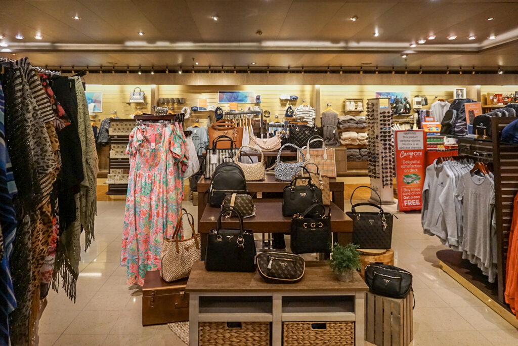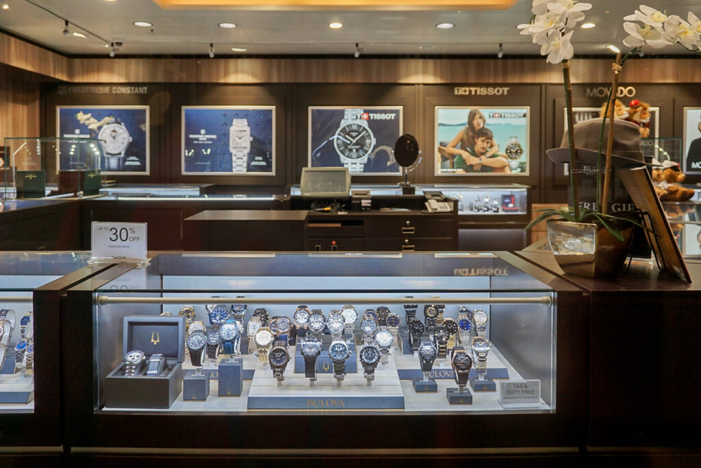 免税ショッピングが楽しめる「ショップ」には、ウォッチやジュエリーなどのラグジュアリーな装飾品も並びます。クルーズの思い出にぴったりな記念の品が見つかるかも。