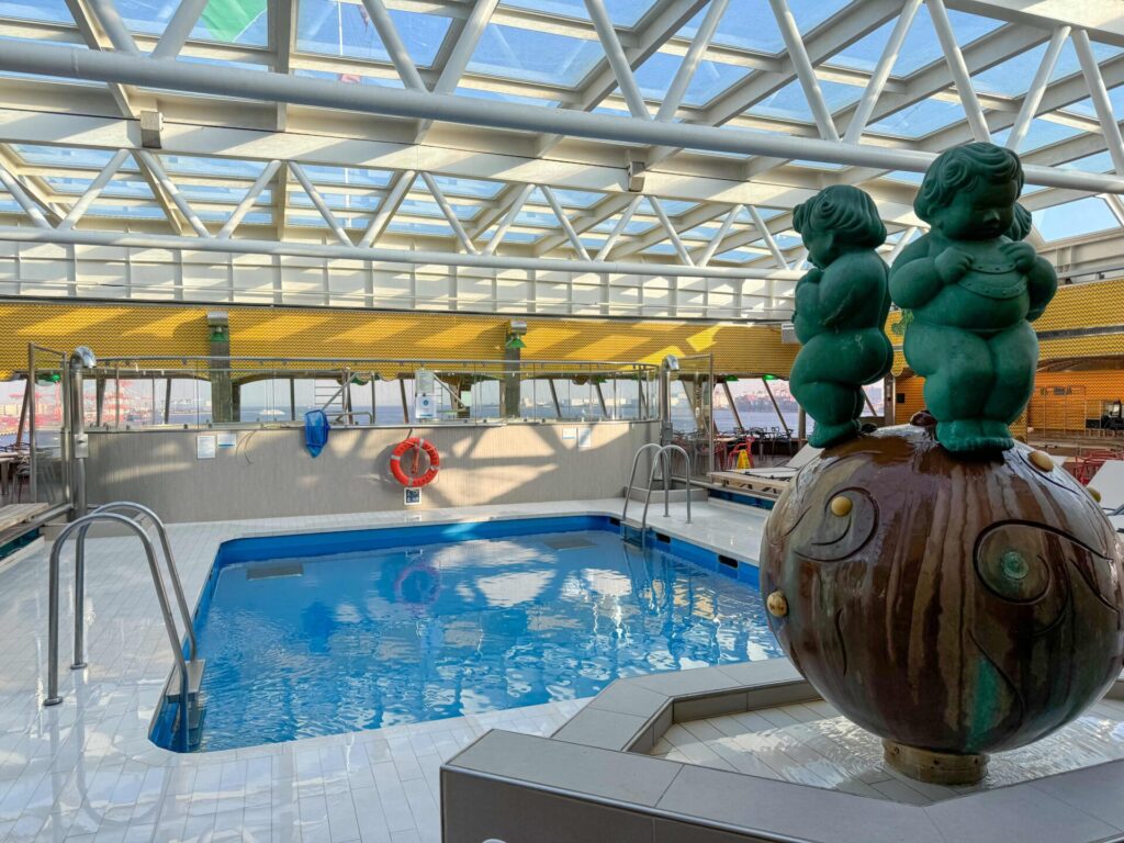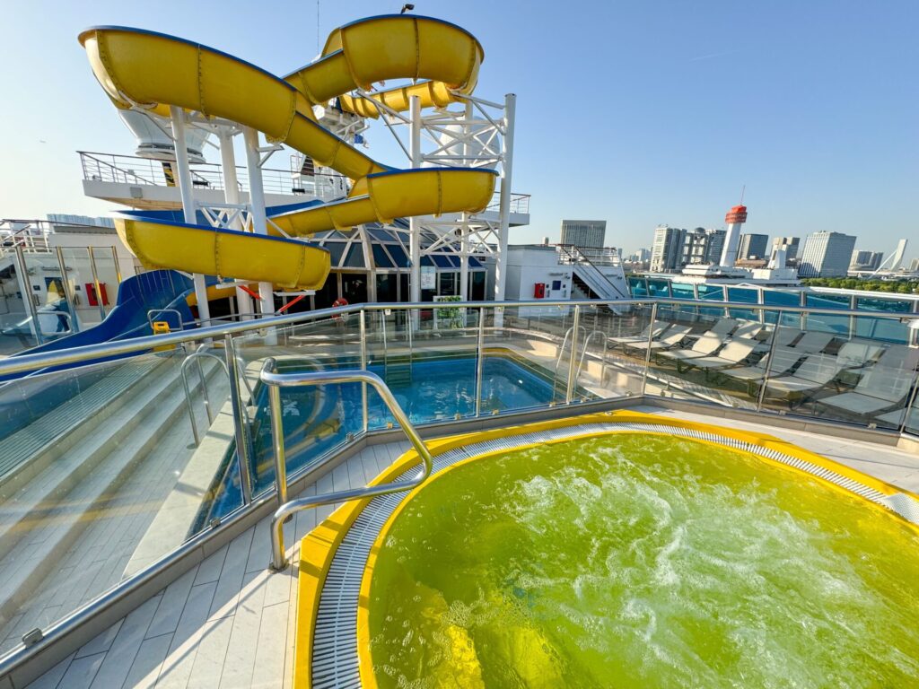 船内にはプールにウォータースライダーも完備。