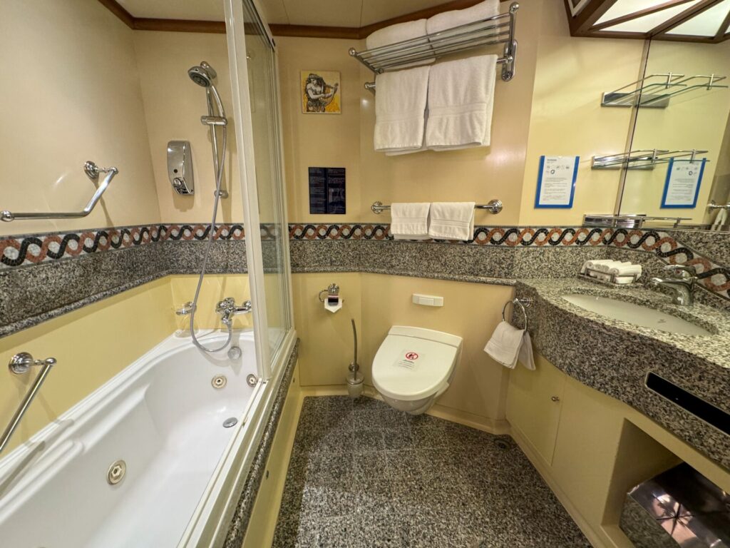 シャワーはお湯もしっかり出るし、水圧もパーフェクト。本当に船の中?と思うほどの充実した設備で、とても綺麗でした。