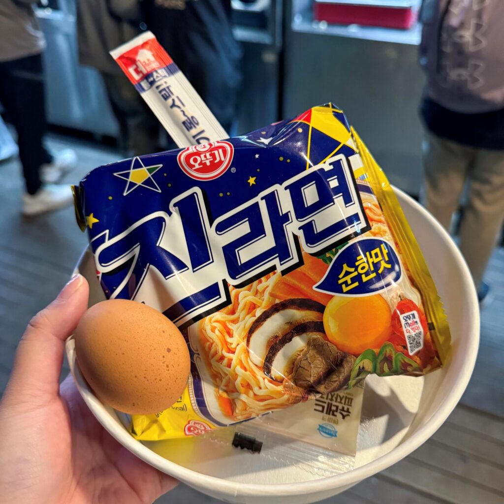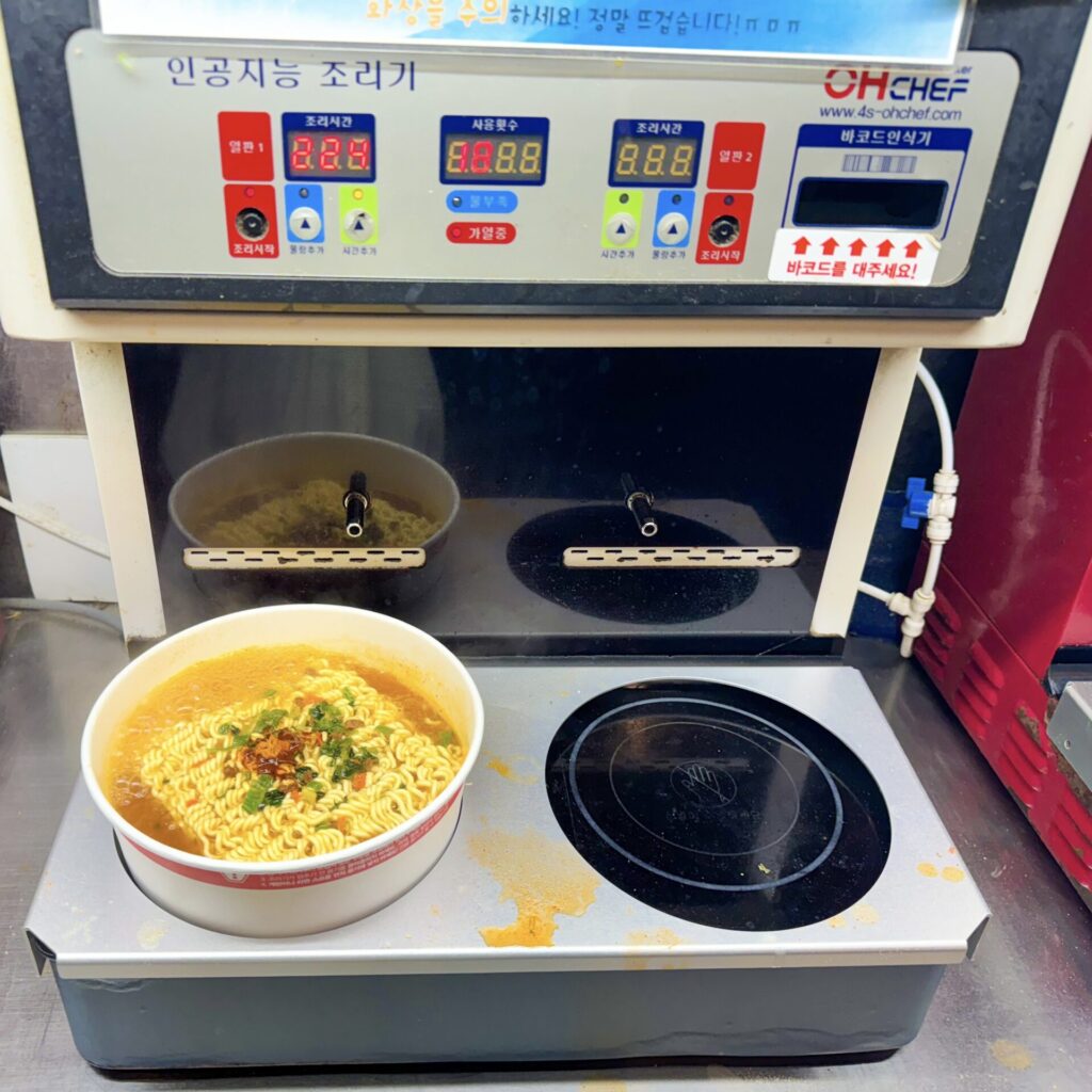 小腹がすいたら、現地の若者にも人気の「漢江ラーメン」コンビニでインスタント麺と食材を買って、専用の機械で自分で作るラーメンは格別!