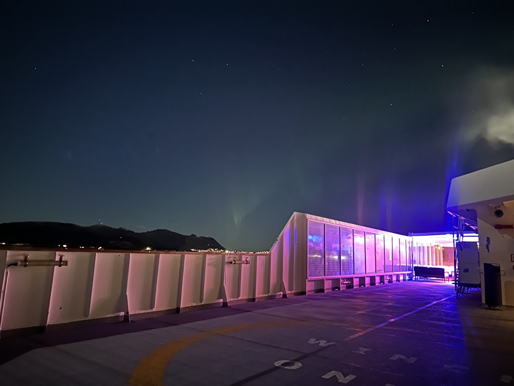 ちなみに、オーロラが出現すると船内アナウンスが入るので、部屋で作業などをしていてもオーロラを見逃さずにすみます。