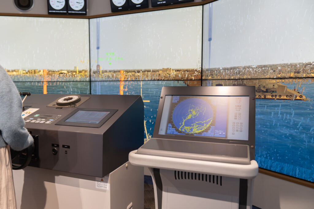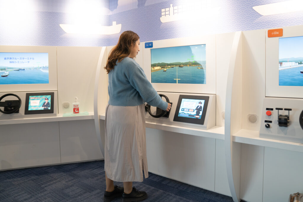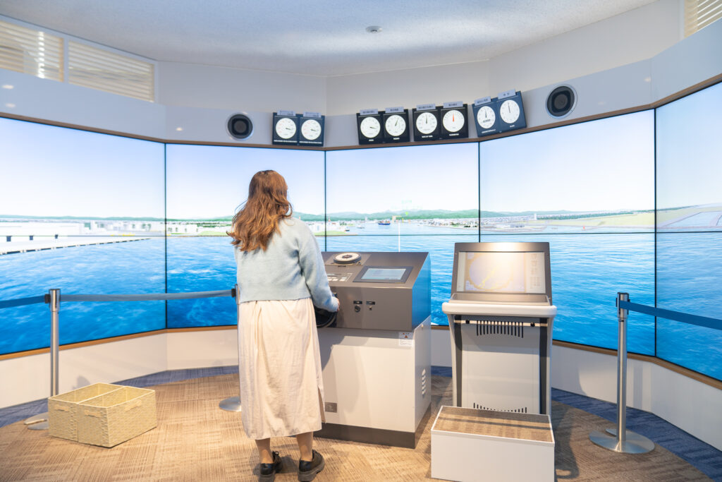 100円で体験できる「金沢港操船シミュレーター」は、180度の大パノラマ画面での操縦が可能。まるで船長になった気分で、金沢港への入港をリアルに体感できます。