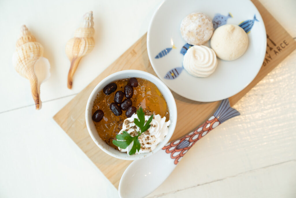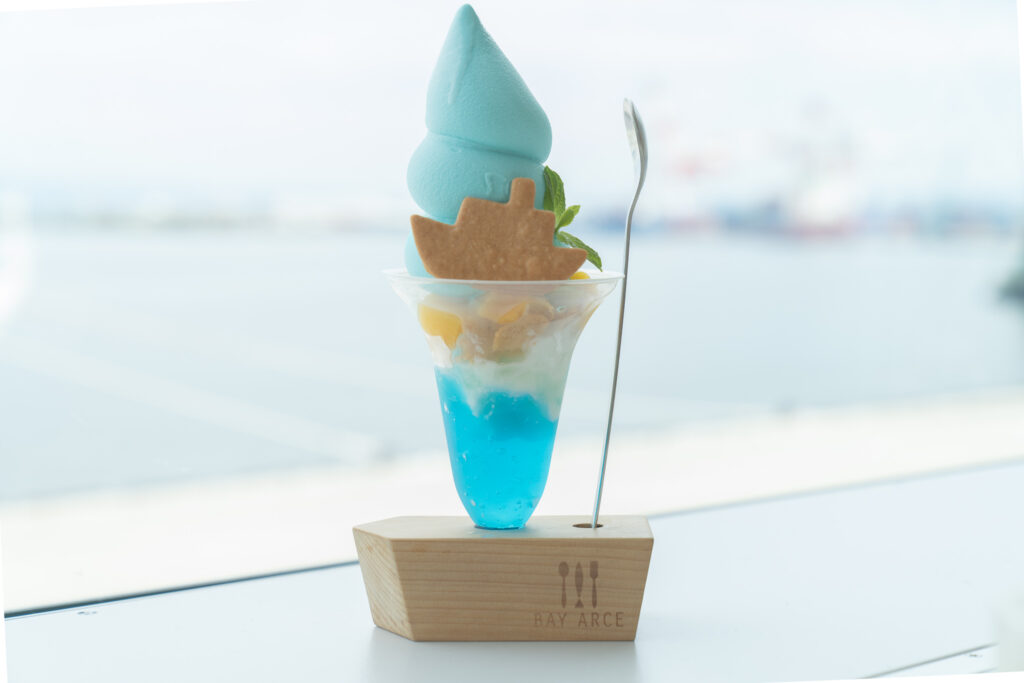 水色が目を引く「ベイアルセパフェ(820円)」も人気の一品。 ほんのり甘じょっぱい塩ソフトに、船型のクッキーが愛らしいアクセントに。 パイナップル風味のゼリーが口の中で弾け、まるで海風を感じるかのような爽やかなひとときを演出してくれます。