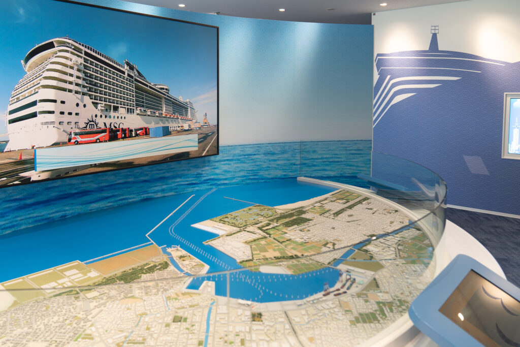 港の全貌を一望できるジオラマと、それを補完する動画が金沢港の魅力や施設の機能をわかりやすく紹介してくれます。