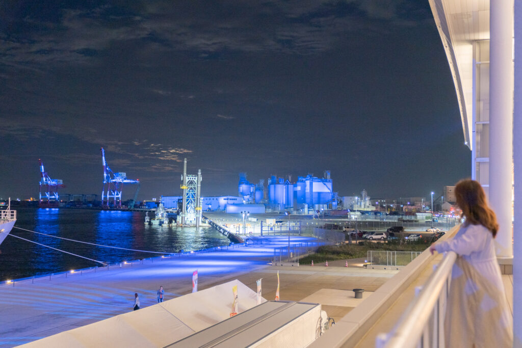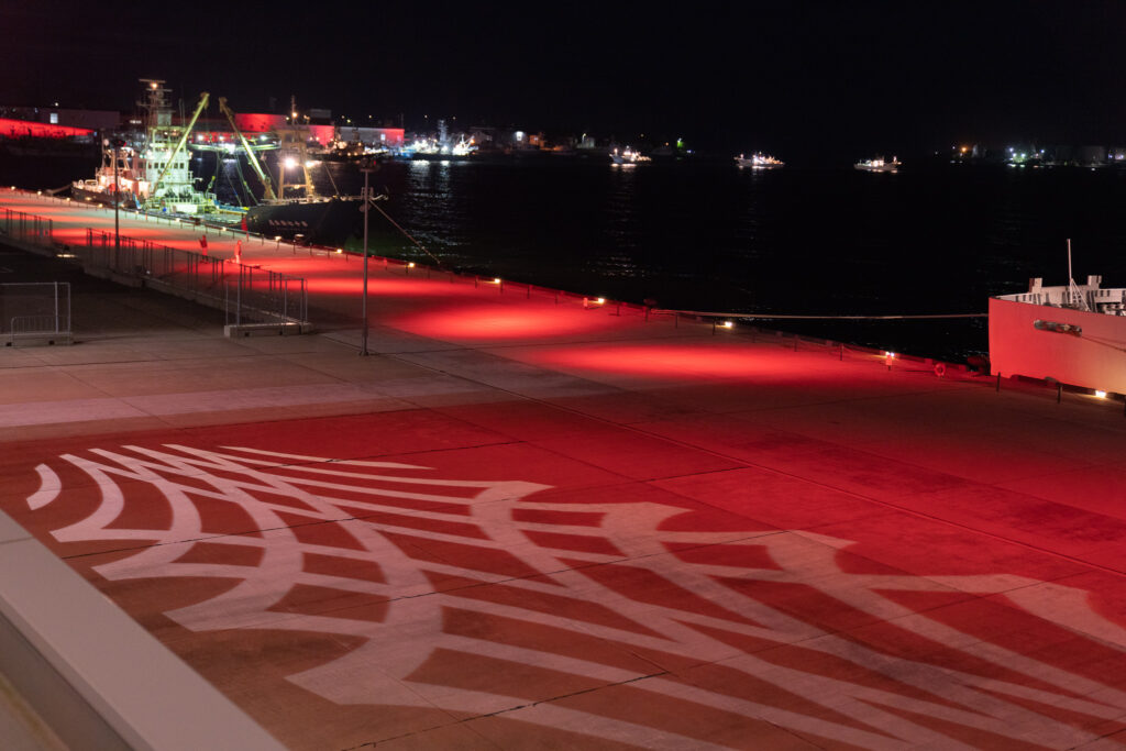 夜になると、約3kmにわたる金沢港一帯が加賀五彩をイメージしたライトアップに照らされ、ターミナル周辺は一気に幻想的な光の空間に変わります。