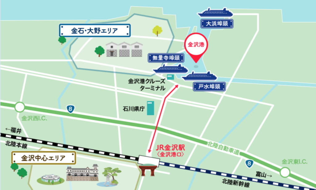 金沢港は金沢駅から車やタクシーで約15分、路線バスで約30分と、市街地から少し離れていながらもアクセスは良好です。特に路線バスは、金沢駅から金沢港クルーズターミナルへの直通便があるため、ストレスなく向かえます。