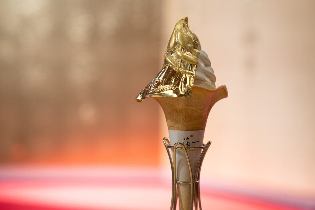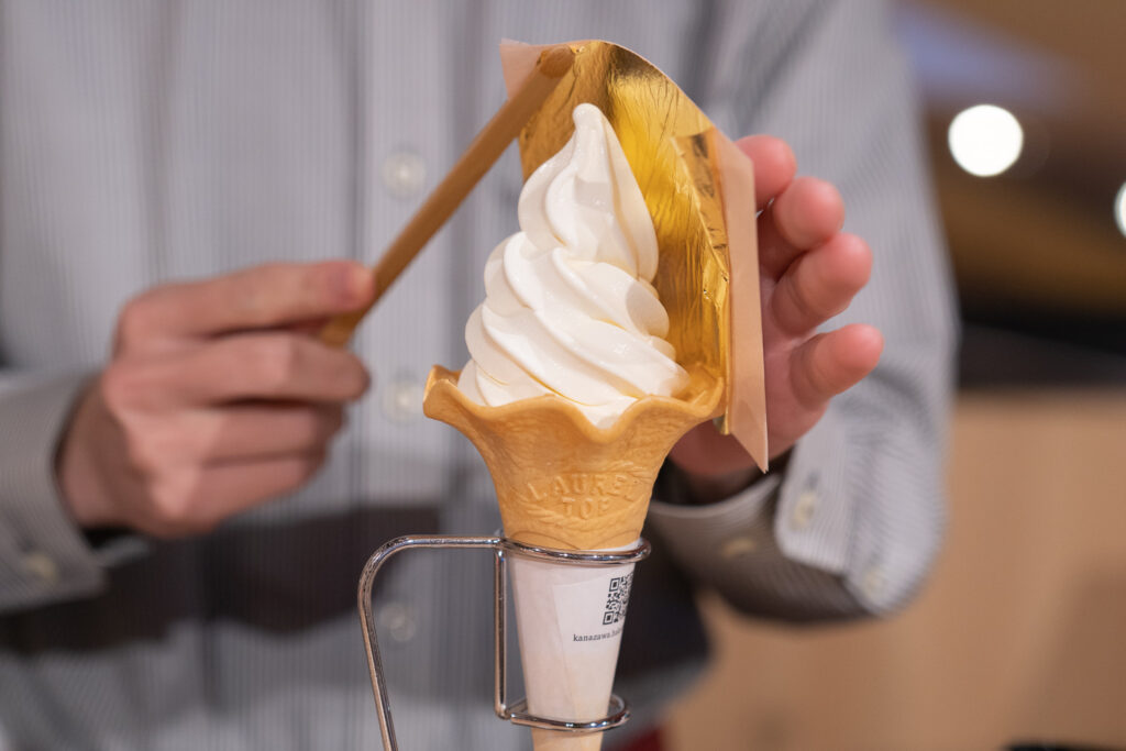 金沢箔の名店「箔一」で出会える特別な逸品、金箔ソフトクリーム。贅沢に金箔一枚を大胆にあしらったその姿は、まるで芸術品のよう。目の前で金箔を乗せる瞬間は必見です。職人が竹箸で金箔をすくい、ソフトクリームに丁寧にあしらう様子は、まさに匠の技。金箔の薄さや輝き、美しさを間近で感じることができます。