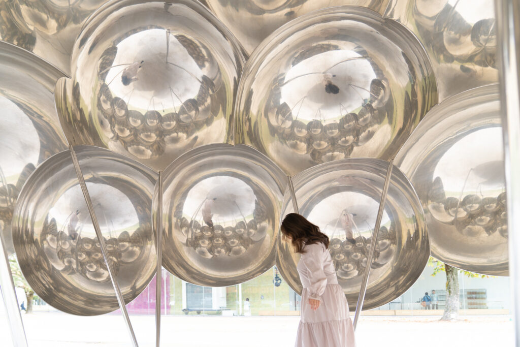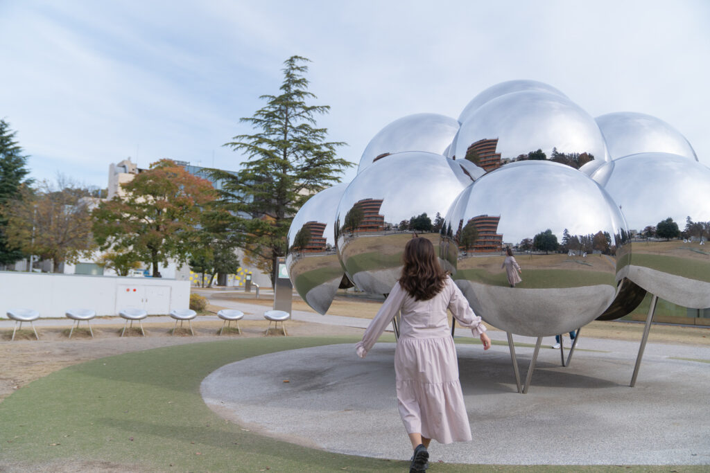 球体のパビリオン「まる」は、開館10周年を記念して2016年に誕生した新しいシンボル。16個のステンレス製の鏡面球が連なり、青空や雲、周囲の建物が映り込むその姿は、まるで空に浮かぶ雲やブドウの房、トンボの目を思わせるような幻想的なアートです。外側を楽しんだあとは、ぜひ内側へ。