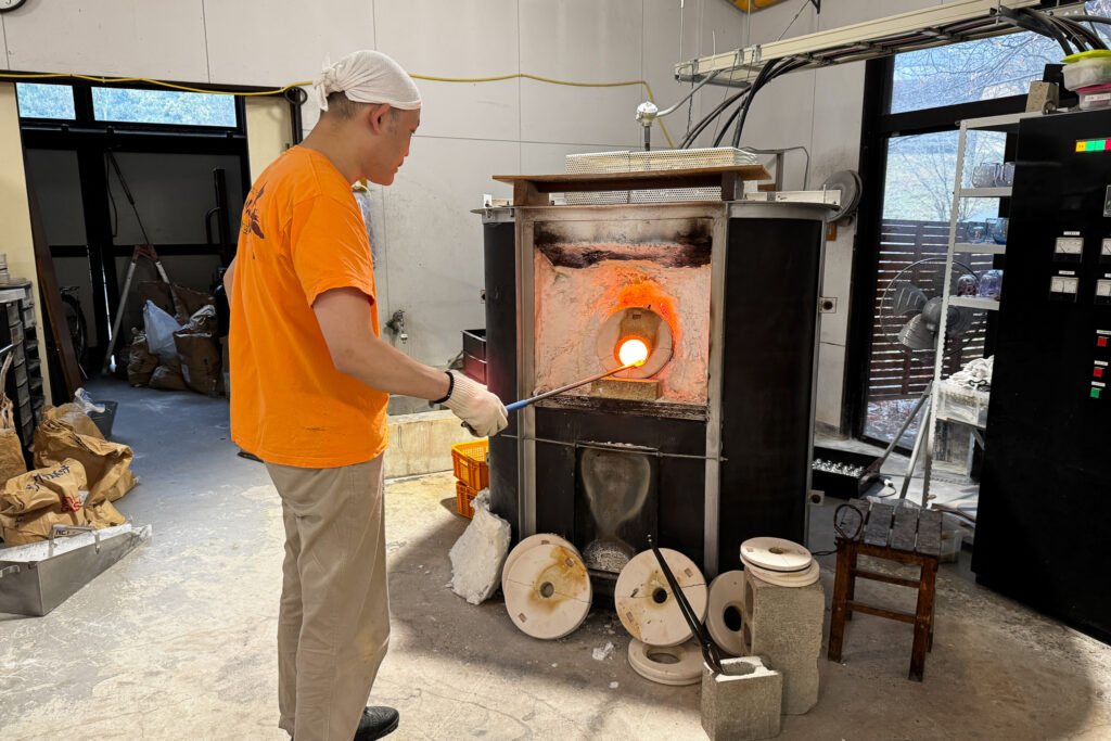 今回体験したメニュー以外に、特別に吹きガラス体験も見せていただきました。熟練の職人さんが1,300℃のガラスに息を吹き込む様子には圧倒されます。